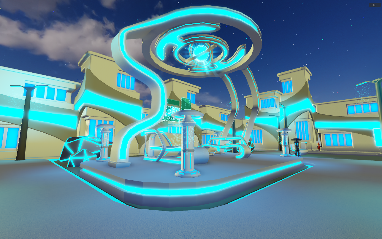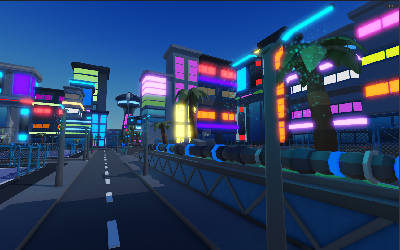 A futuristic basketball simulator map designed with a modern city aesthetic. Featuring sleek buildings, open play areas, and a clean layout optimized for smooth gameplay and visual clarity.