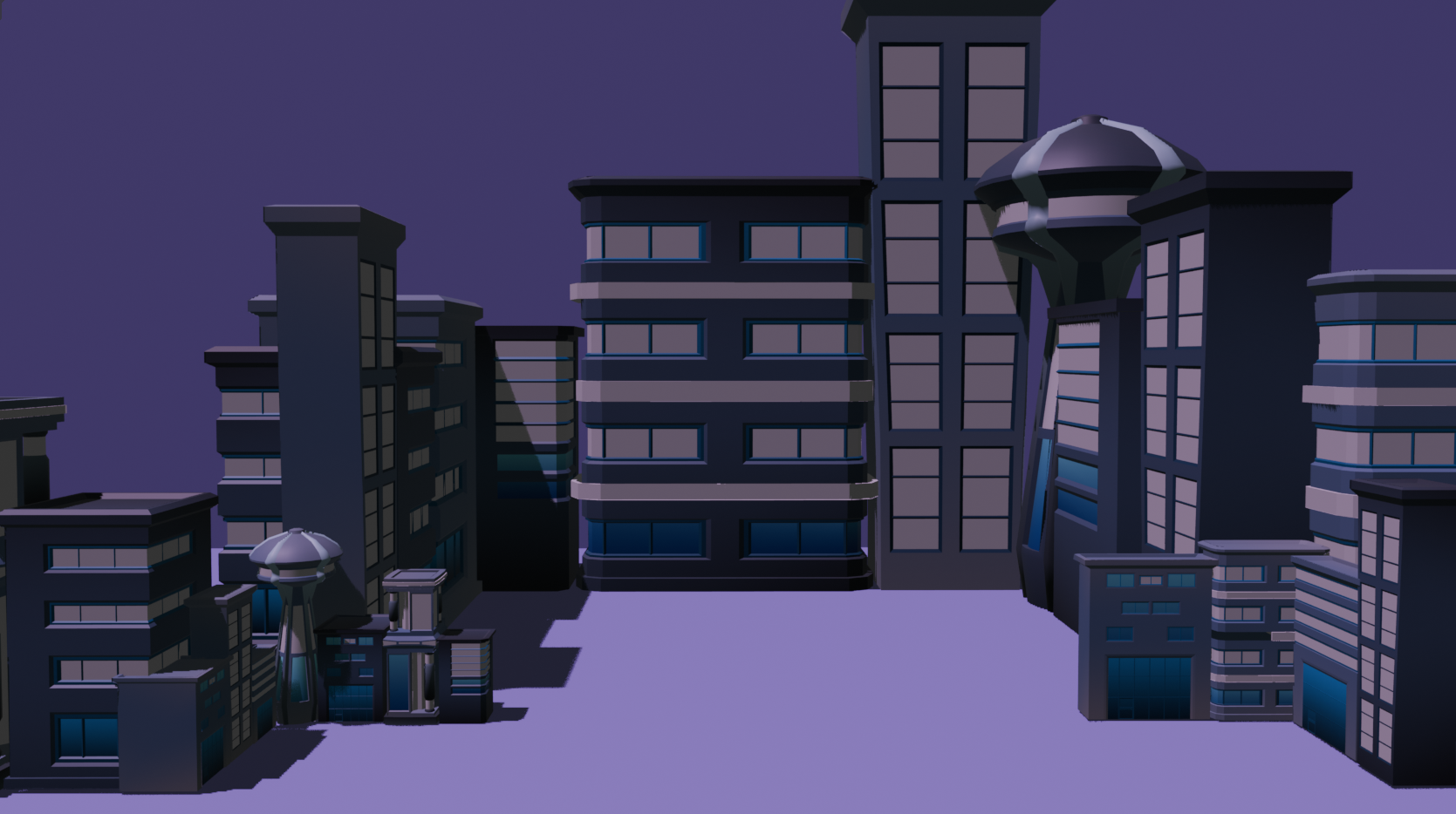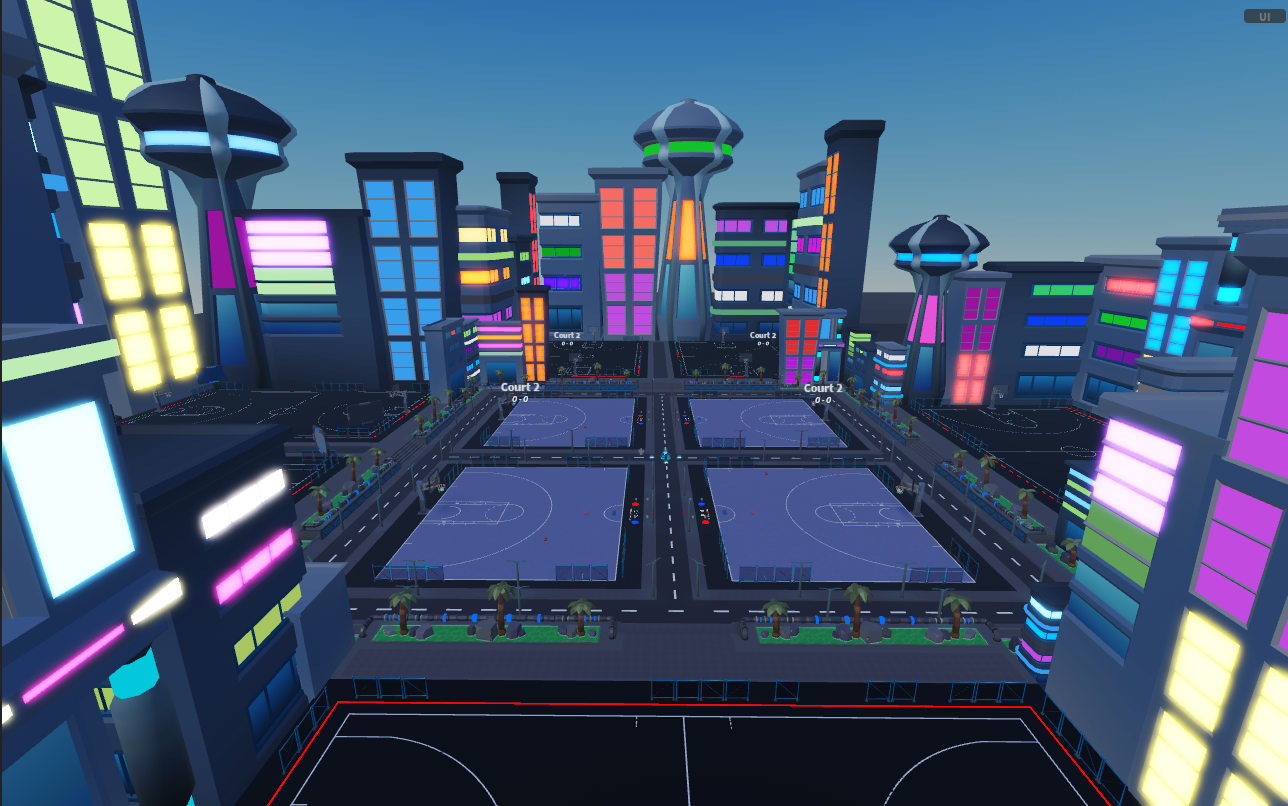 A futuristic basketball simulator map designed with a modern city aesthetic. Featuring sleek buildings, open play areas, and a clean layout optimized for smooth gameplay and visual clarity.